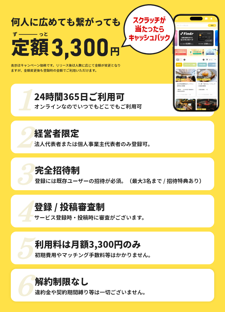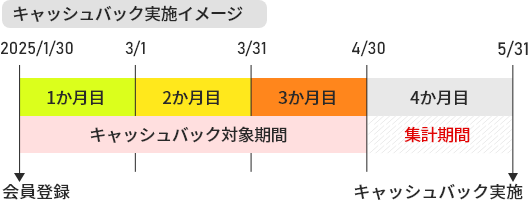 本ページから会員登録いただくと、最大3か月間分のご利用料金をキャッシュバックいたします。4か月目以降もご利用になられる場合は月額3,300円の費用が発生いたします。